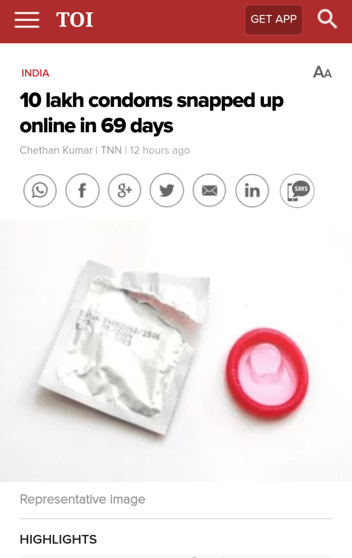 Read the entire article here: https://m.timesofindia.com/india/10-lakh-condoms-snapped-up-online-in-69-days/articleshow/61611721.cms
